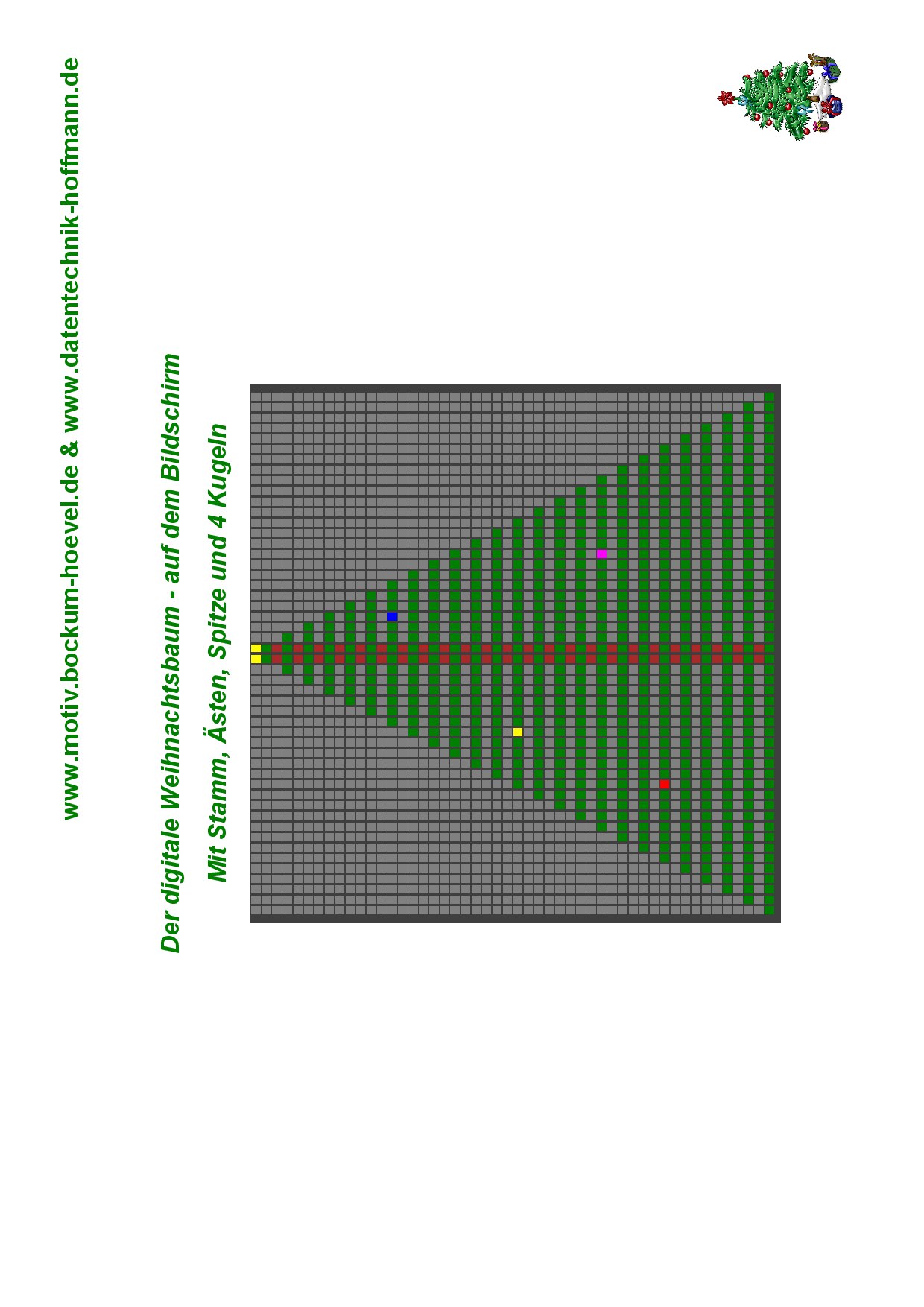 Programmtext zum KopierenMit Anmerkungen (REM)Beim Eintippen kann man die Zeile mit dem REM-Befehlen weglassen. Das sind nur Bemerkungen (engl. REMark) 100 cls 110 rem s steht für eine Spalte (0..49) 111 rem z für eine Zeile (0..49) 200 rem Stamm zeichnen 210 for s=24 to 25 220 for z=0 to 49 230 plot s, z, "brown" 240 next z 250 next s 400 rem Äste zeichnen 410 let v=0 420 let b=49 430 for z=0 to 49 step 2 440 for s=v to b step 1 450 plot s, z, "green" 460 next s 470 let v=v+1 480 let b=b-1 490 next z 690 rem Spitze zeichnen 700 plot 24,49, "yellow" 710 plot 25,49, "yellow" 800 rem Kugeln aufhängen 810 plot 12, 10, "red" 811 plot 34, 16, "magenta" 812 plot 17, 24, "yellow" 813 plot 28, 36, "blue" 850 rem Grüße im Textfenster 860 print "Frohe und gesunde Weihnachten" 870 print "www.motiv.bockum-hoevel.de" QuiteBasic kannst Du bei Bedarf mit dem folgenden Internet-Link startenwww.QuiteBasic.comZur Motiv e.V. - Homepage |