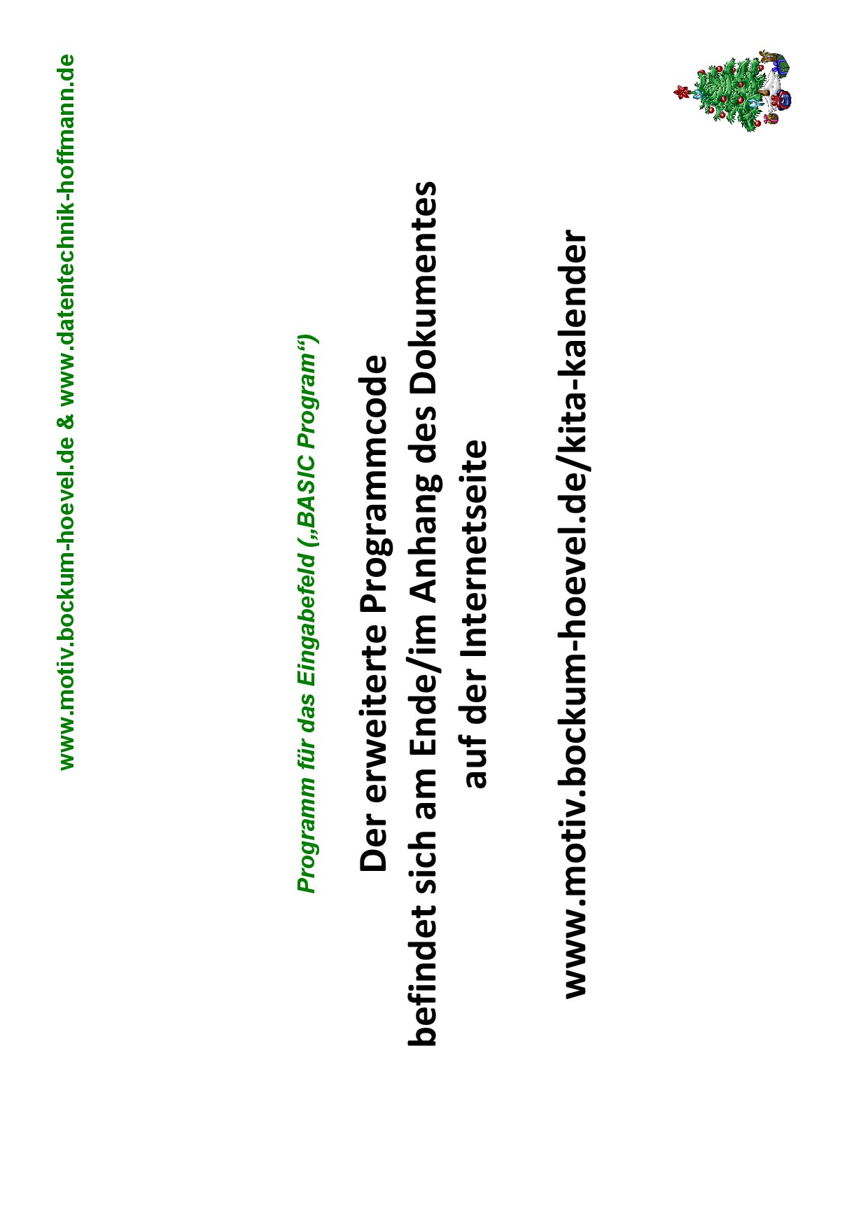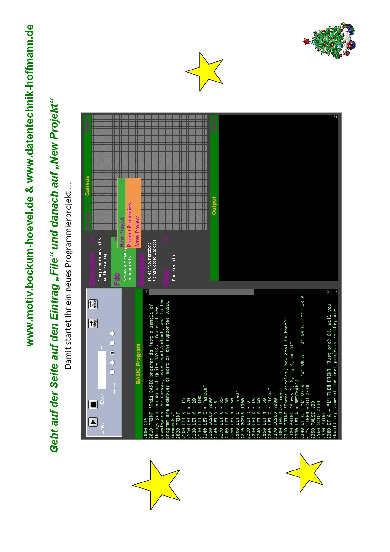 Digitaler Weihnachtsbaum 2020![]() Programmiere mit unserer Anleitung einen Weihnachtsbaum. Als Programmiersprache nutzen wir dazu online im Internet "QuiteBasic". Man braucht nicht alles sofort zu verstehen! Einfach mit Mama oder Papa oder einem Freund/einer Freundin eintippen! QuiteBasic kannst Du bei Bedarf mit dem folgenden Internet-Link startenMit dem hier folgenden Link kannst Du die komplette Anleitung auch laden und z.B. ausdruckenAnleitung (als PDF-Datei)Und hier ist die Anleitung zur Programmierung für den "Digitalen Weihnachtsbaum" direkt auf dieser Internetseite![]() Zum Seitenanfang ![]() Zum Seitenanfang ![]() Zum Seitenanfang ![]() Zum Seitenanfang ![]() Zum Seitenanfang ![]() Zum Seitenanfang ![]() Zum Seitenanfang ![]() Zum Seitenanfang ![]() Zum Seitenanfang |
